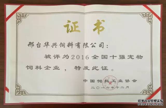 2016年12月9日,中國飼料工業(yè)協(xié)會第七次會員代表大會在北京召開,會議對2016年度中國飼料工業(yè)協(xié)會先進集體及先進工作者進行了表彰, 華興公司榮獲“2016全國十強寵物飼料企業(yè)”稱號。